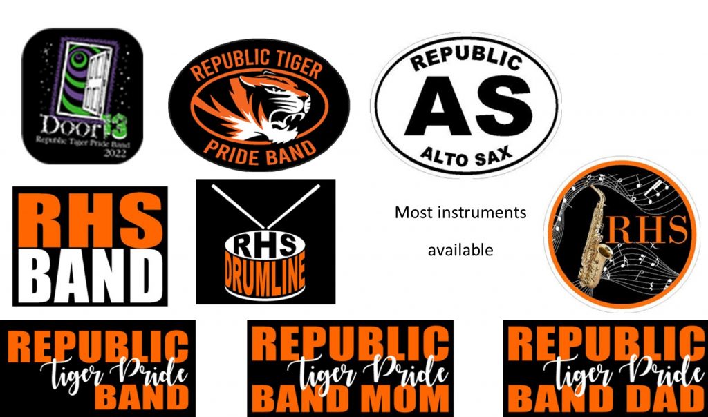 Check out the vinyl to show your Republic Tiger Pride Band pride! The Door 13 logo is available, as well as the RTPB logo – and instrument specific vinyl as well!